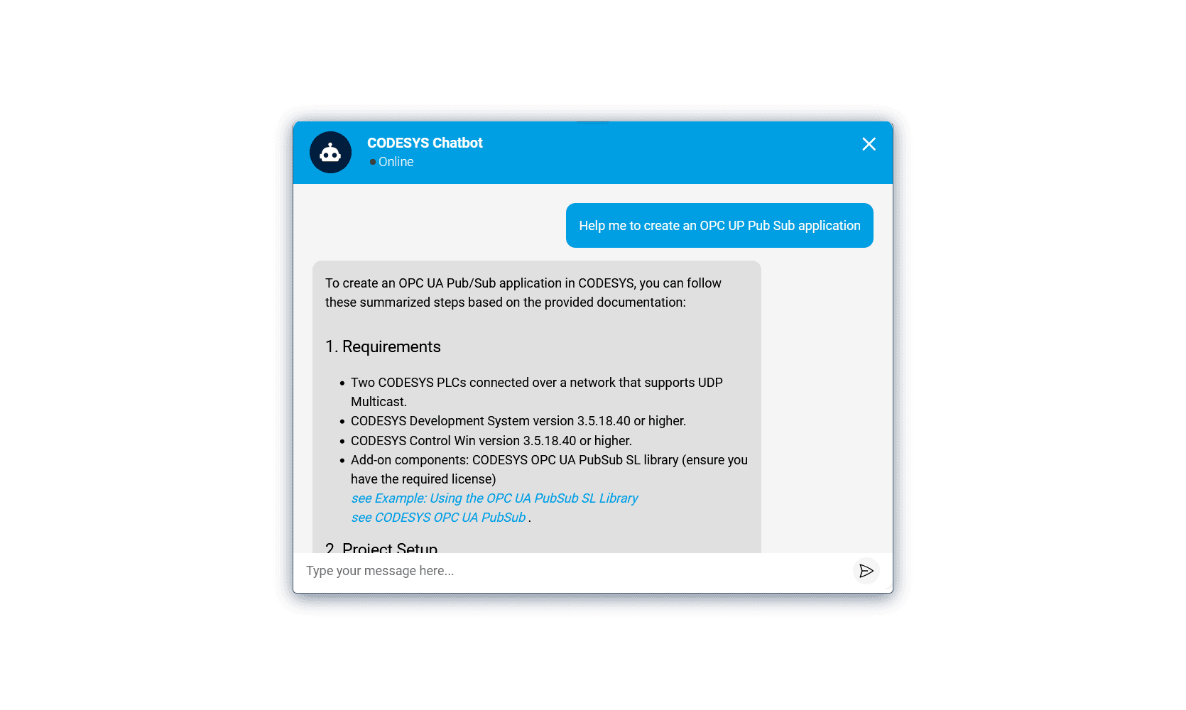 - No AI hallucinations! It uses only the CODESYS Online Help and does not return any result if it cannot find suitable information there.