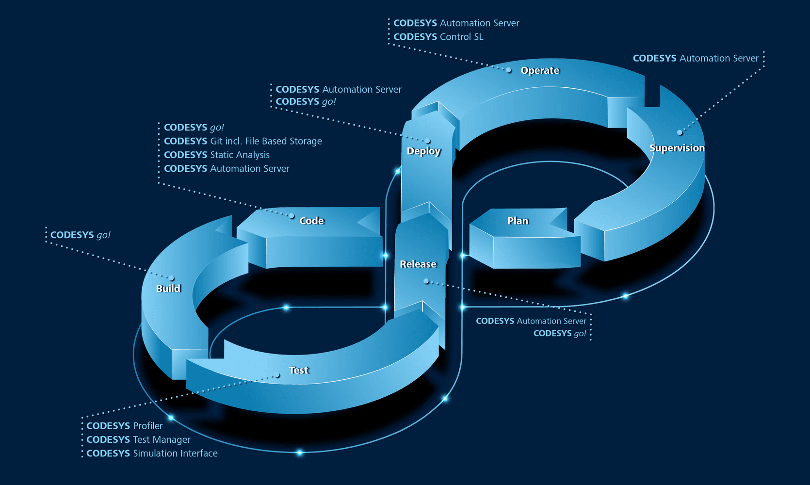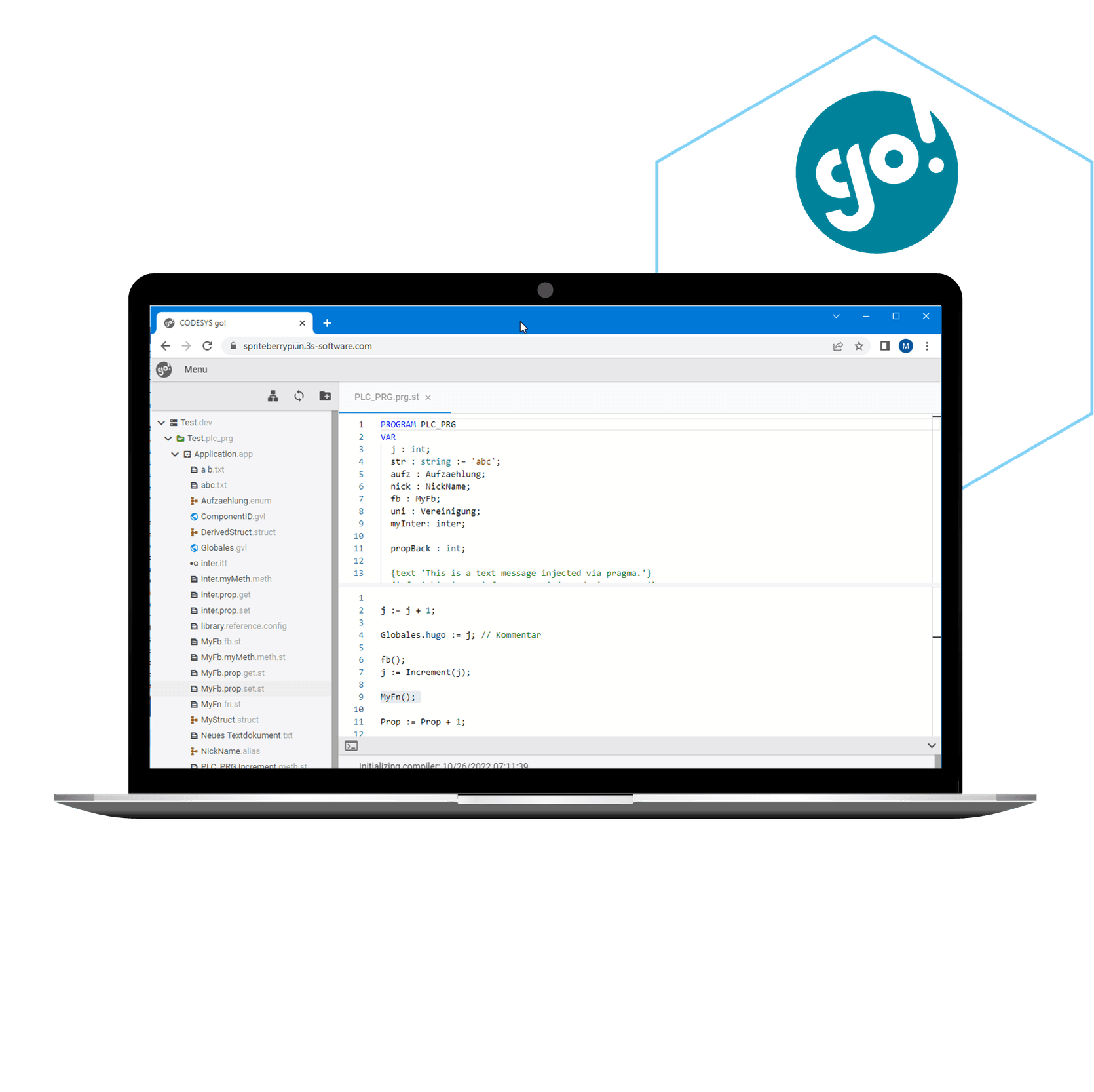 CODESYS go! is a web-based development environment for controlling machines and systems. The architecture is divided into frontend and backend; in IT, this is regularly referred to as a server/client solution. In the case of CODESYS go! the frontend also corresponds to the client, but the backend can run not only on an (edge) server, but also in the cloud, on standard PC hardware or even on the PLC itself.