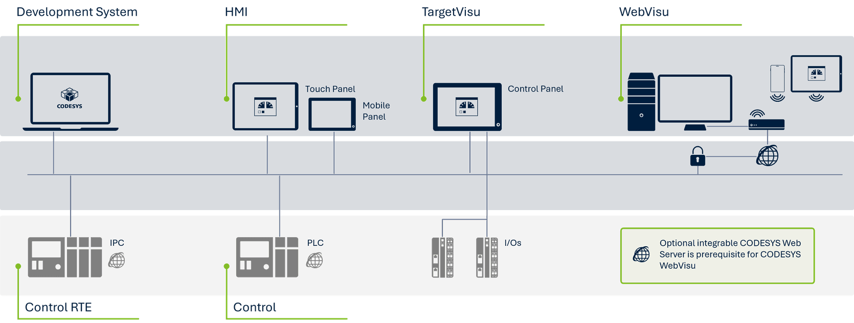 CODESYS Visualization is available as CODESYS WebVisu, CODESYS TargetVisu, and CODESYS HMI. The functional scope of these three variants is largely identical, but the technical functions differ.